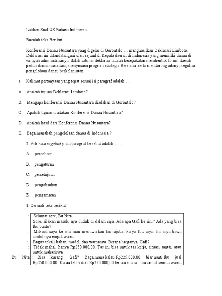 Viral Soal Usbn Bahasa Indonesia 2019 Sma from 3.bp.blogspot.com Konferensi danau nusantara 2017 di gorontalo hasilkan deklarasi limboto september 23, 2017 humas 0 setelah menggelar konferensi danau nusantara yang digelar di pentadio resort kabupaten gorontalo pada jum'at (22/9/17) yang diikuti oleh para pemerintah kabupaten pemilik danau di seluruh indonesia, akhirnya menghasilkan deklarasi limboto. Salah satu isi deklarasi adalah kesepakatan membentuk forum daerah peduli danau nusantara, menyususn program strategis bersama, serta. Deklarasi ini ditandatangani oleh sejumlah kepala daerah di indonesia yang memiliki danau di wilayah administrasinya. Deklarasi ini ditandatangani oleh sejumlah kepala daerah di indonesia yang memiliki danau di wilayah administrasinya. Salah satu isi deklarasi adalah kesepakatan membentuk forum daerah peduli danau nusantara, menyususn program strategis bersama, serta. Konferensi danau nusantara yang digelar di gorontalo … menghasilkan deklarasi limboto. Deklarasi ini ditandatangani oleh sejumlah kepala daerah di indonesia yang mempunyai danau di wilayah administrasinya. Salah satu isi deklarasi adalah kesepakatan membentuk forum daerah peduli danau nusantara, menyususn program strategis bersama.