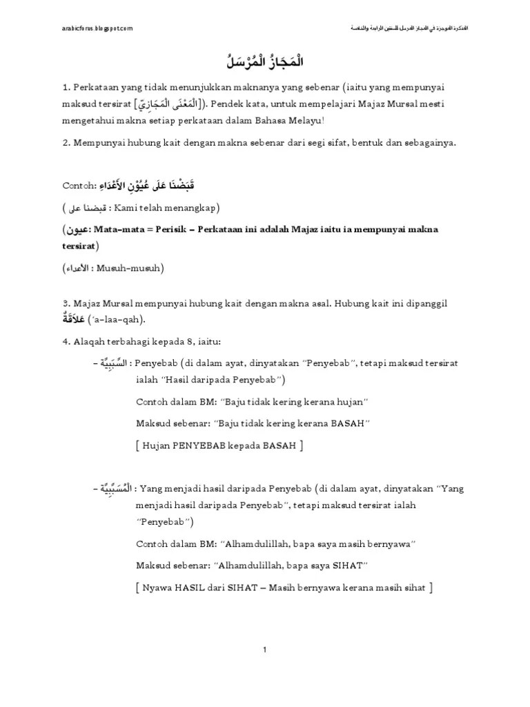 Pembagian majaz dilihat dari beberapa sudut pandang. Salah satu pembahasan dalam ilmu balaghoh adalah majaz. Majaz mursal adalah penggunaan kata bukan untuk makna yang sebenarnya karena adanya hubungan dengan makna majazi yang selain keserupaan serta . Urdu to english meaning of (عِلمِ بَیان) مَجاز مَرسَل کا مطلب انگریزی میں ( ilm e bayan ) majaz marsal translation from urdu into english means antonomasia. Penggunaan elemen ini menyumbang kepada perluasan makna, bersifat mengemukakan gambaran boleh nampak .